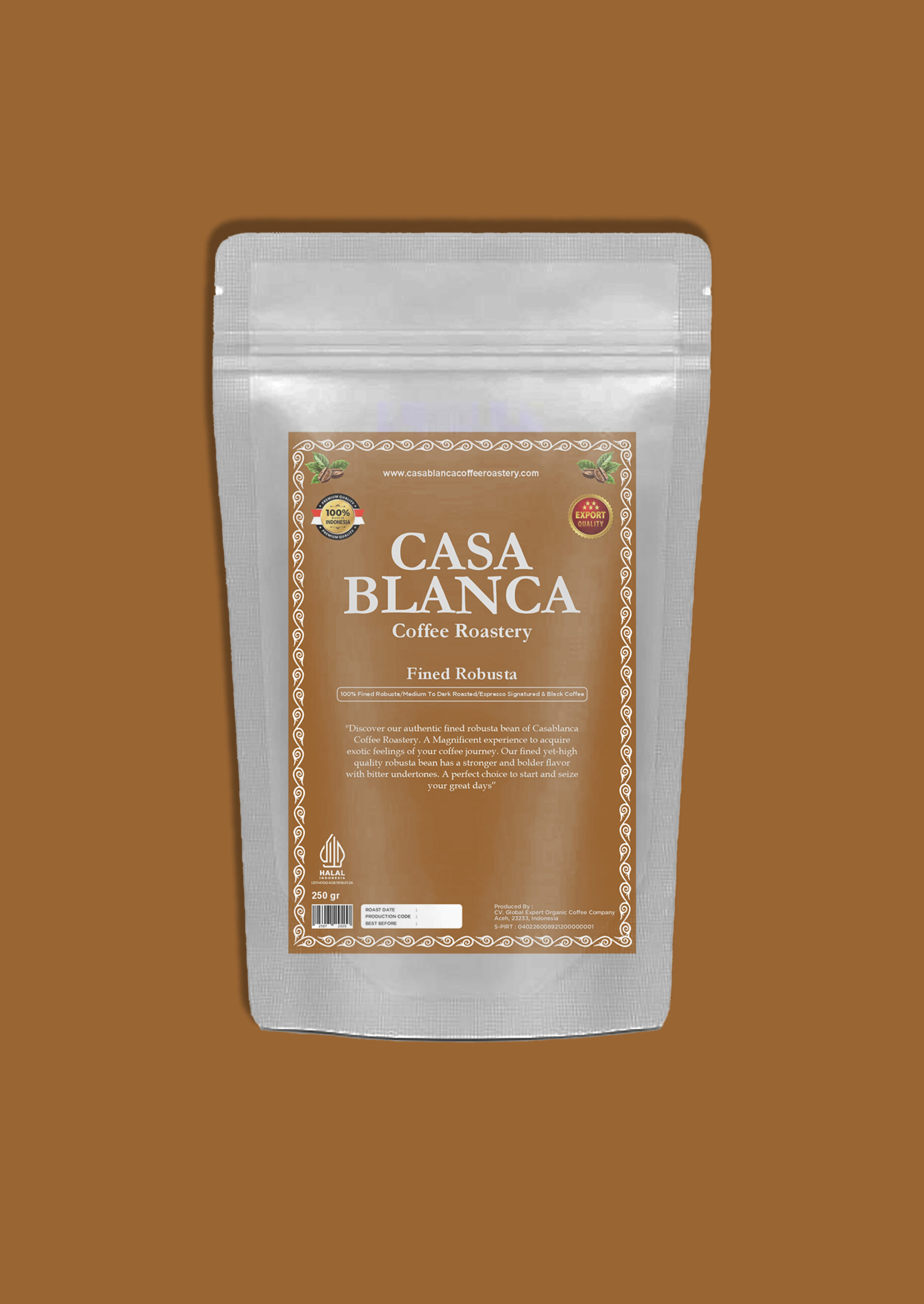 “Discover our authentic fine robusta bean of Casablanca Coffee Roastery. A magnificent experience to acquire exotic feelings of your coffee journey. Our fine yet high-quality robusta bean has a stronger and bolder flavor with bitter undertones. A perfect choice to start and seize your great days.